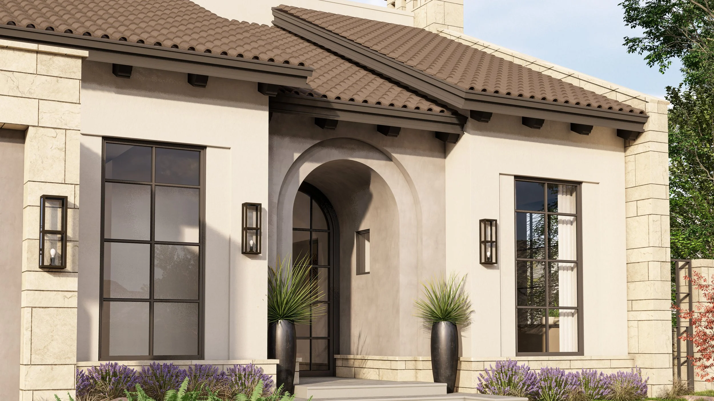 Esta residencia de un nivel destaca por su simetría, techos inclinados, arcos protagonistas y detalles en piedra natural, logrando una imagen sobria, cálida y atemporal.