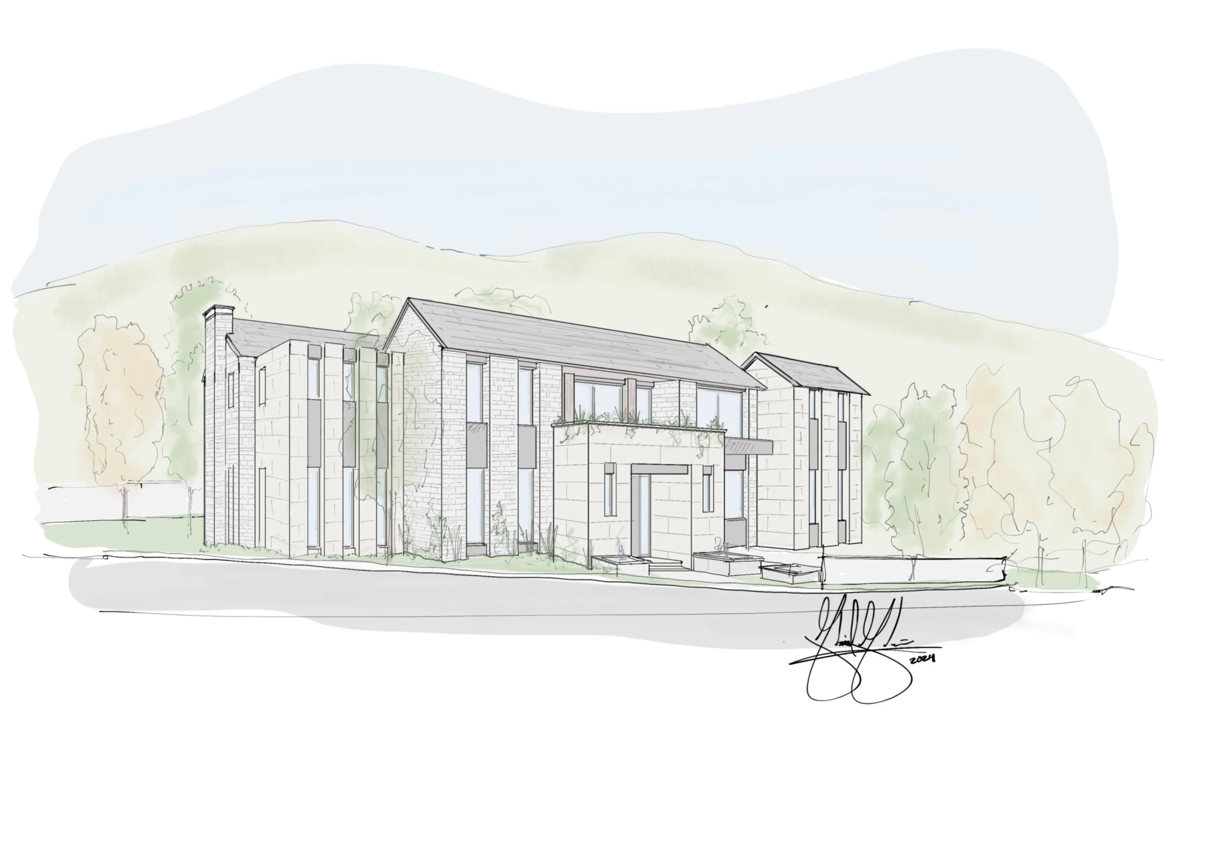 Esta propuesta combina materiales naturales, líneas limpias y volúmenes definidos para lograr una fachada elegante y contemporánea. El diseño responde a la pendiente del terreno, integrando vegetación y buscando equilibrio entre privacidad y apertura.